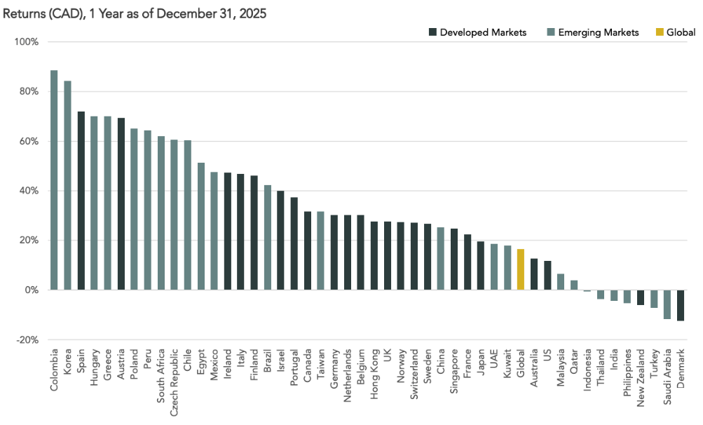 - Most developed markets, including Canada and Europe, delivered solid but more moderate gains. These returns clustered around the 20–40% range.