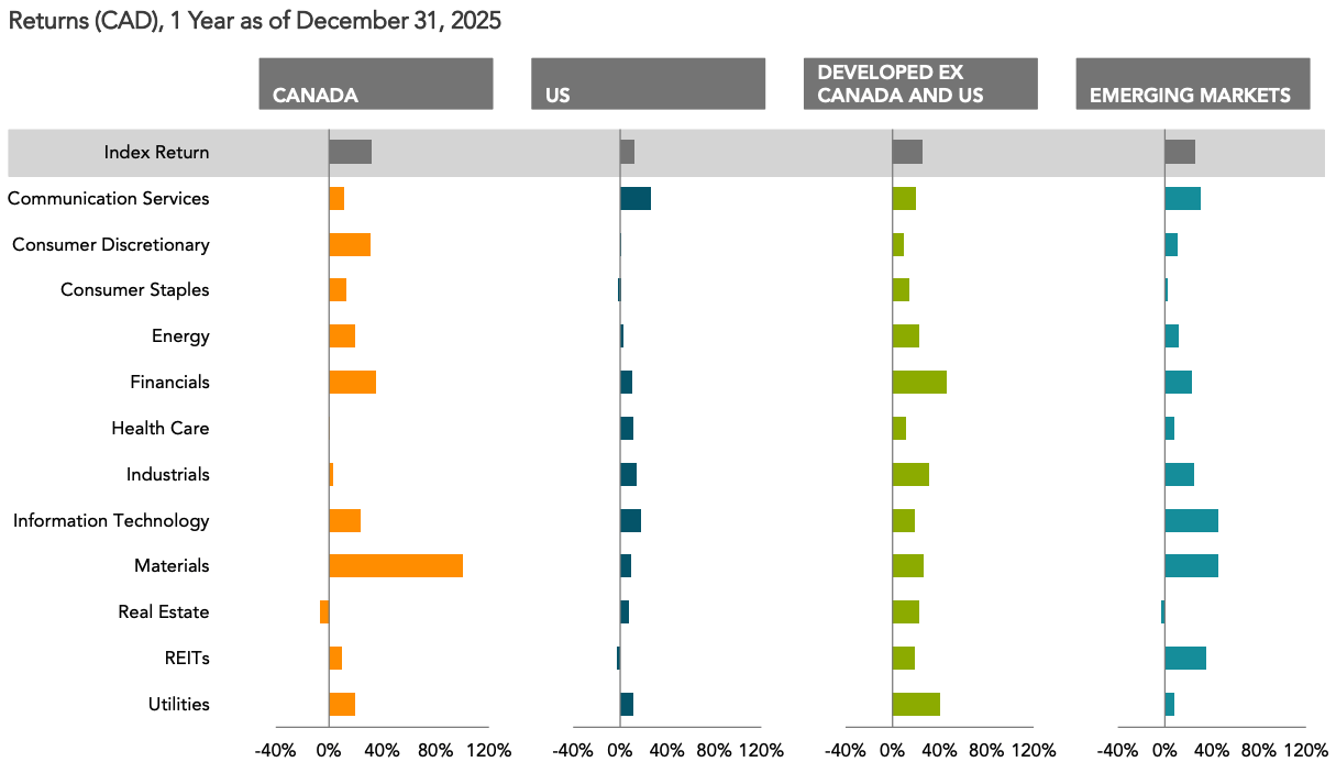 Sector leadership varied widely by region in 2025. Canada’s returns were driven mainly by Materials and Financials, while the U.S. was more concentrated in Communication Services and Technology. Outside North America, Info Tech, Financials, Materials, and REITs played a larger role, especially in emerging markets, highlighting the benefit of global sector diversification.