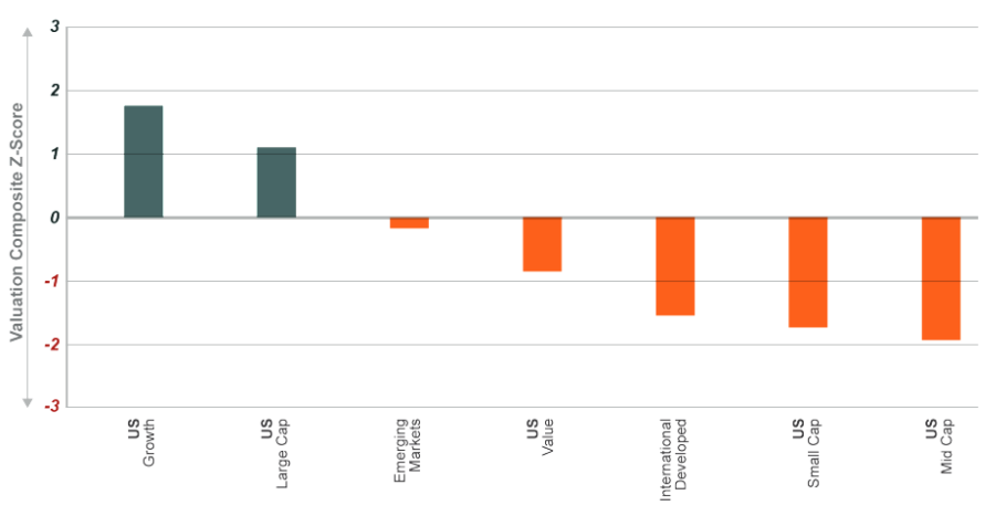 This chart shows a wide valuation gap heading into 2026. U.S. growth and large-cap stocks remain expensive, while international, small-cap, mid-cap, and value stocks are priced well below historical averages.