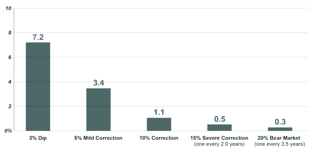 Small market pullbacks are common, while major declines are rare. A 3–5% dip happens frequently (7 times per year), but 10%+ corrections are much less common (1 time per year), and true bear markets (20%+) occur only occasionally (once every 3.5 years). The takeaway is that market volatility is normal, and short-term declines are the cost of earning long-term returns.