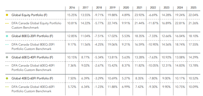 Calendar Returns, CAD. Net of Investment fees. Gross of Advisor Fees.